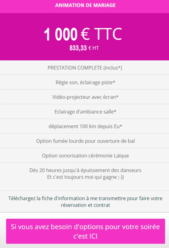 - Conducteur de la soirée.Tout ceci est à fixer au moment de la signature d’un contrat.
